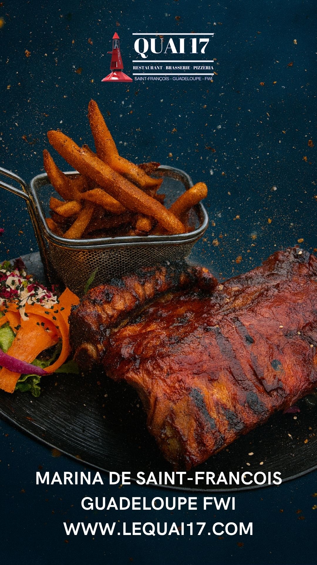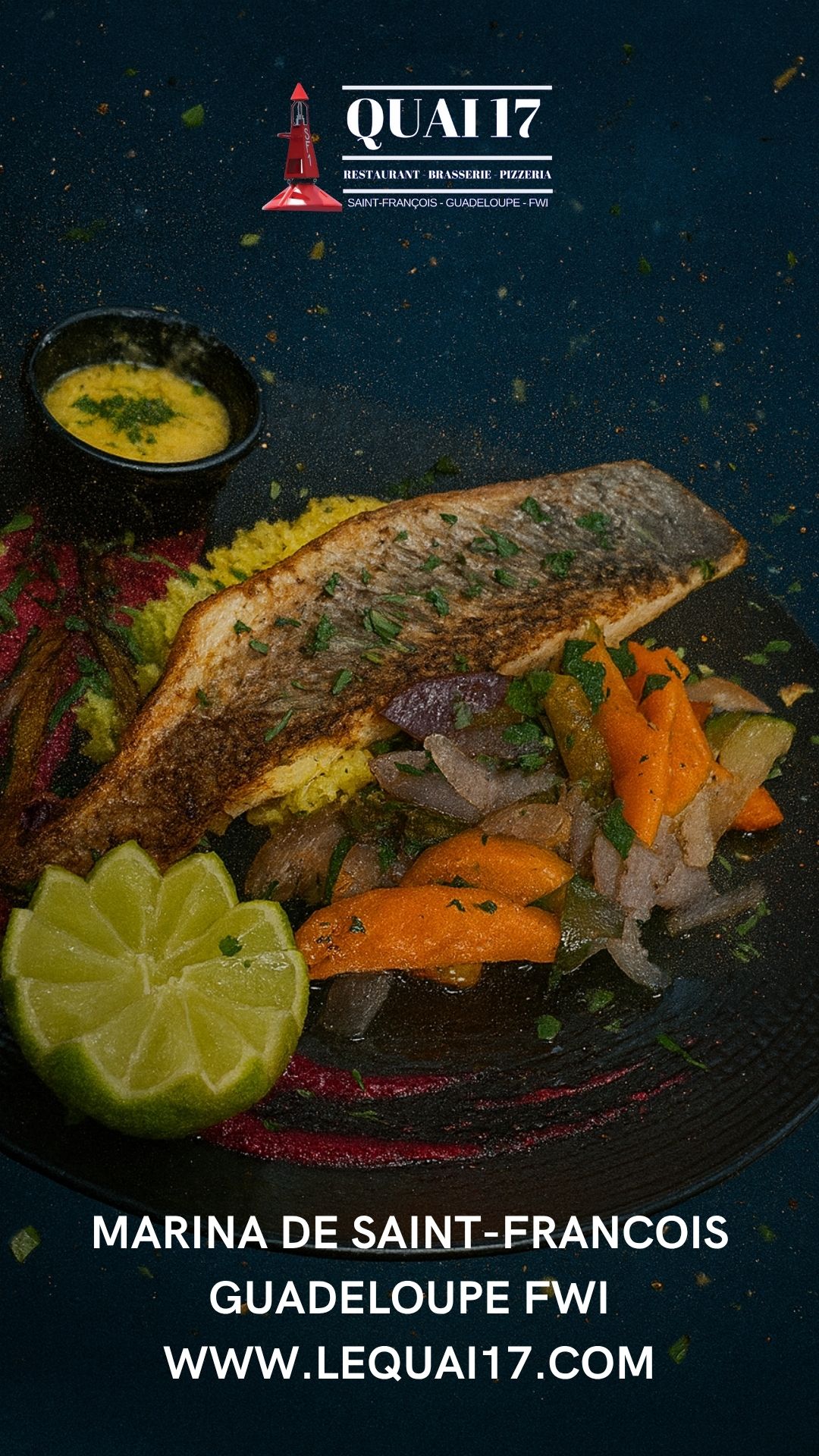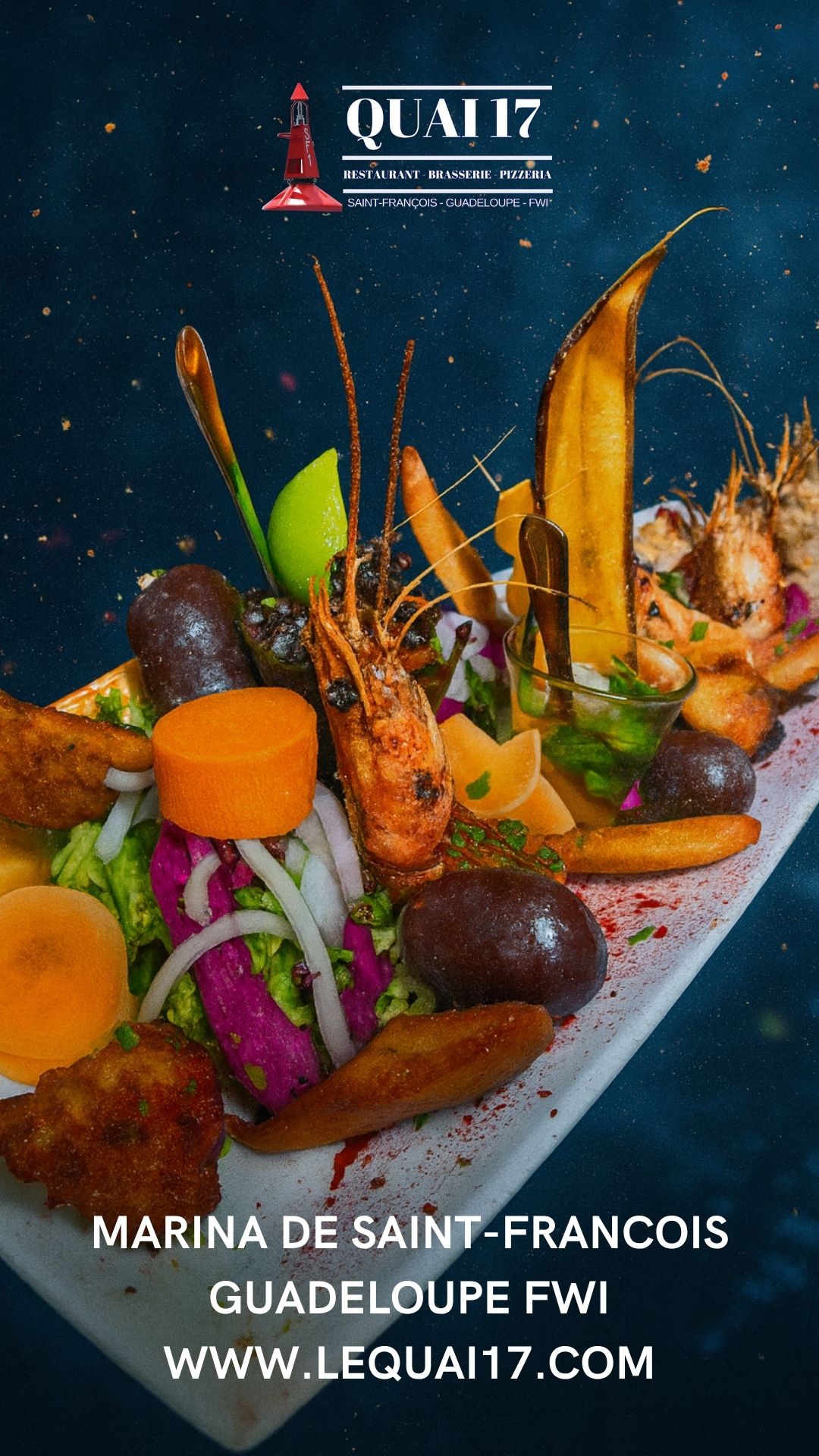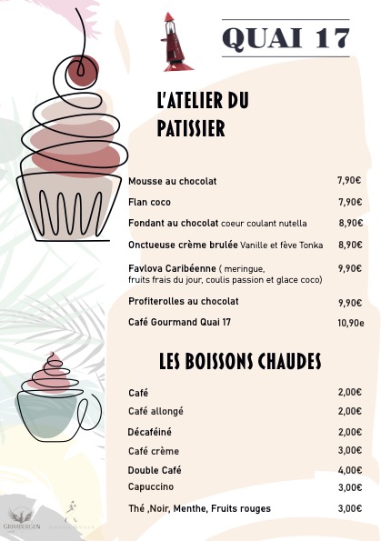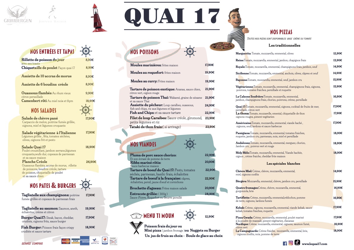 Le restaurant Quai 17 est très populaire pour son accueil, mais aussi pour sa carte qui ne néglige personne : Un large choix de salades fraiches, dont une salade 100% végétarienne, une carte de poissons et de viandes complète et variée pour tous les goûts, une gamme de pizzas cuites au four à bois à consommer sur place ou à emporter et des desserts et glaces pour terminer votre bon repas, en couple, entre amis ou en famille.